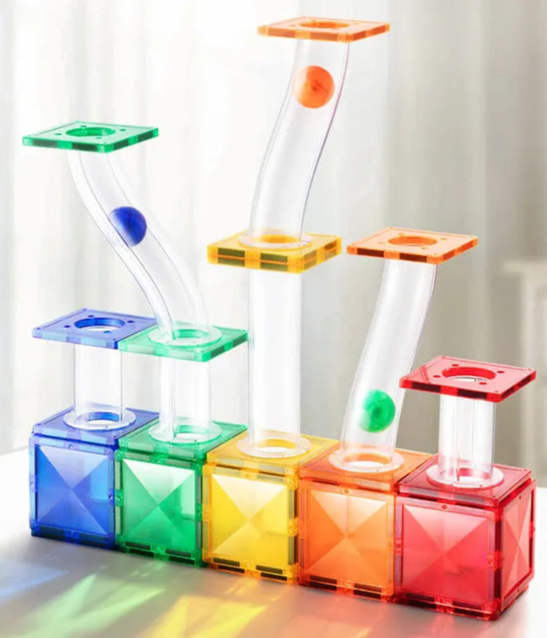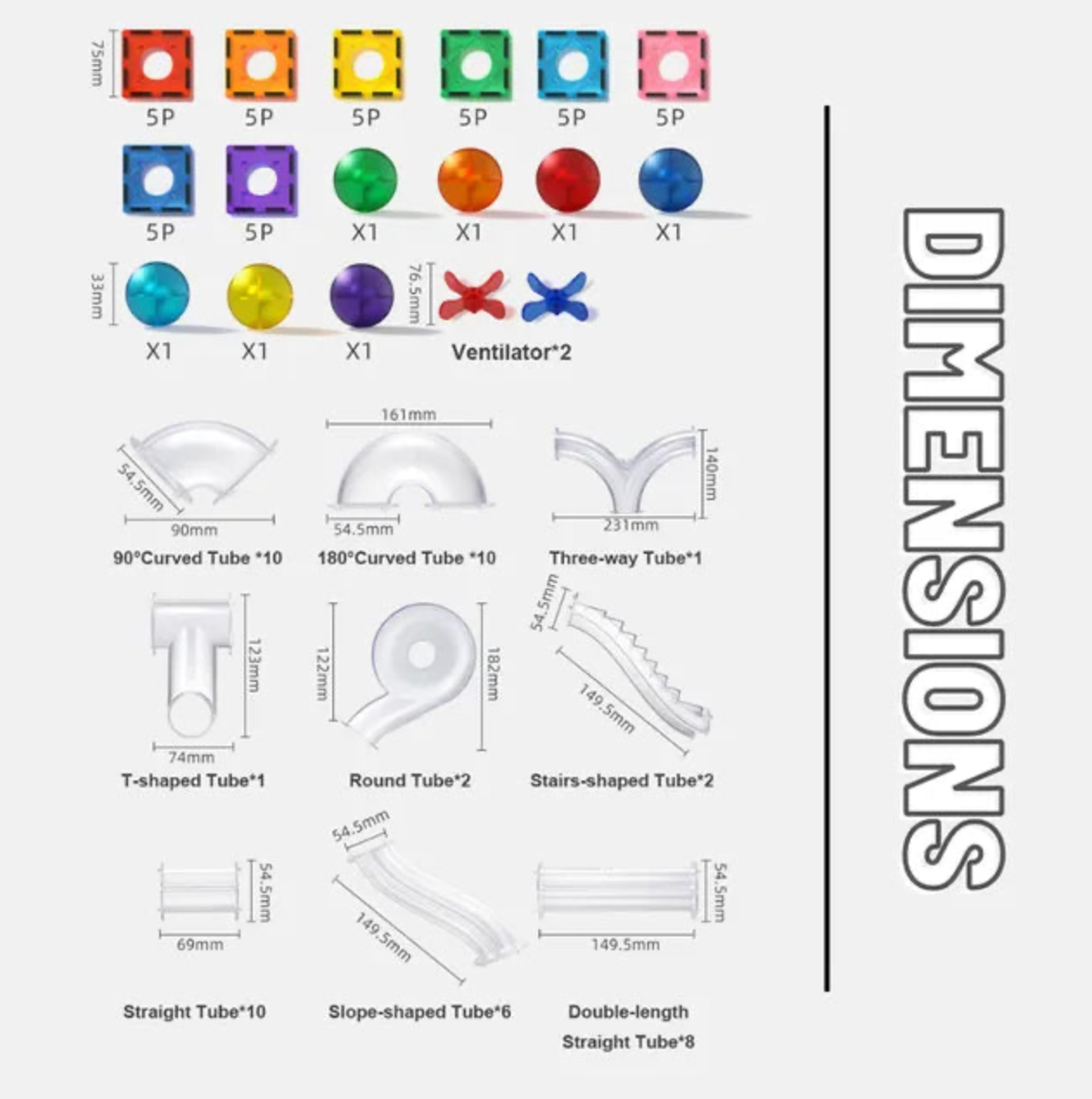 Includes: 100 magnetic pieces for building dynamic marble run structures