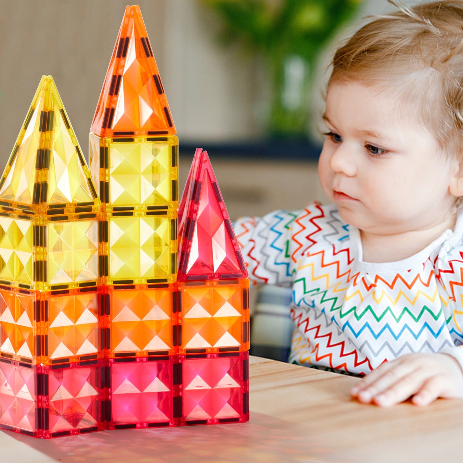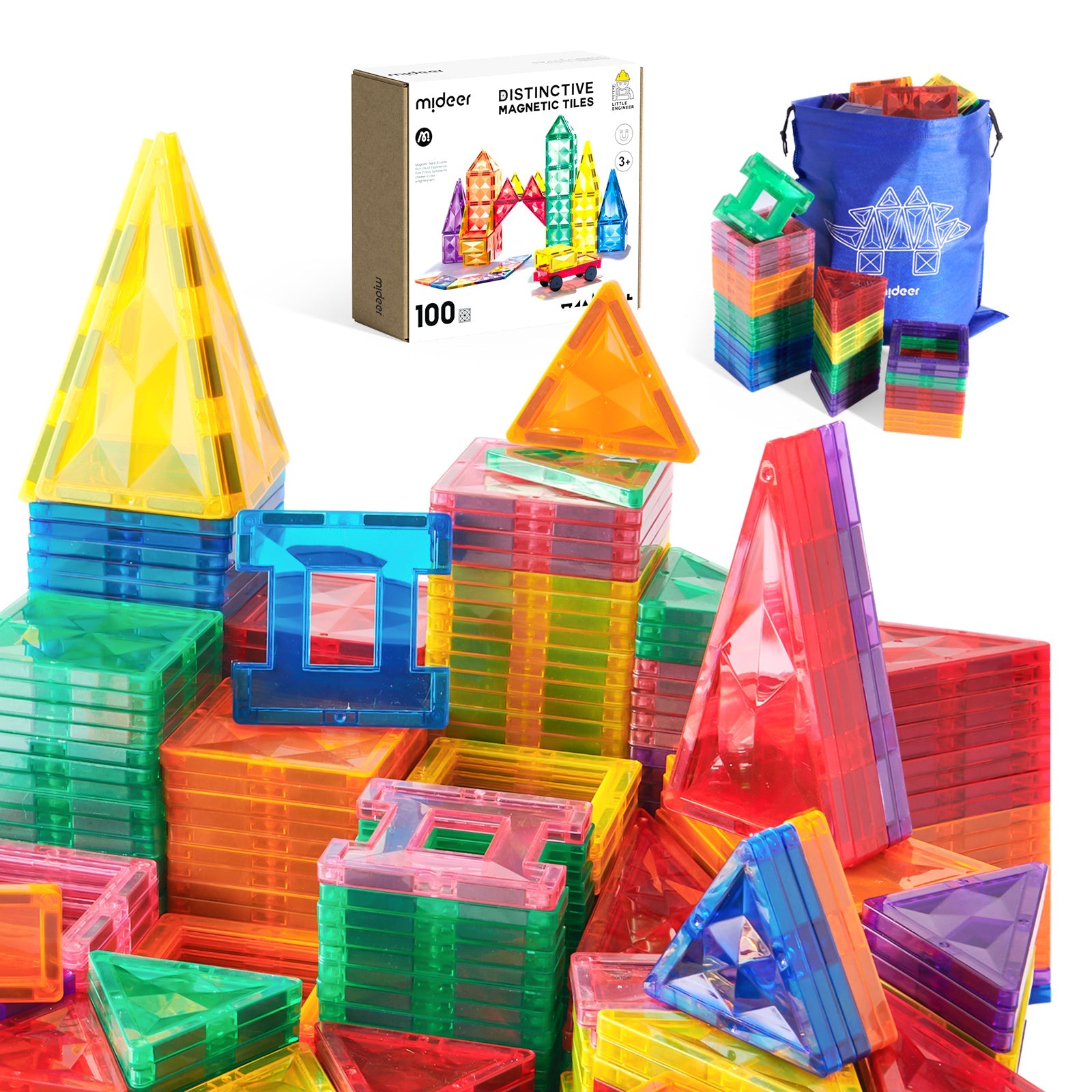 Let your kid's dreams come alive with Distinctive Magnetic Tiles! From flat to 3D, explore geometric knowledge, and let their building skills progress from basic understanding to complex creations. With our unique sloping design, light refracting off those 100 pieces will take them to a magical castle! And with our premium magnetic core, you can trust the building process will be stable and your kid never stop dreaming.