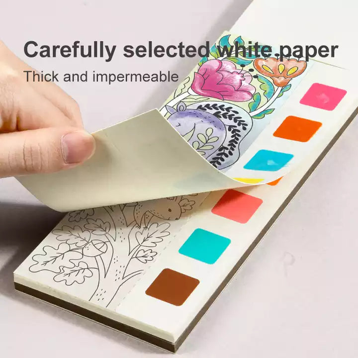2) There are three types of graffiti small picture books with paints in total, fairy tale dream, fantasy forest, dream garden, each with 20 small paintings and color blocks, just dip the paint with a paintbrush. You can start coloring, 3) One color board per page to avoid mixing of pigments. Strictly selected white cardboard, which is thick and does not leak ink.